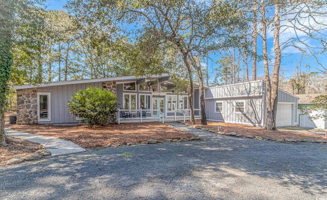 Beautifully updated 3 bedroom 3 bathroom home nestled on a large 0.80 acre lot on the 5th green of Founders Club Golf Course in the highly sought after community of Hagley Estates Pawleys Island. This home has many great features including but not limited to: spacious half circle driveway and attached garage for ample parking as well as detached 20 x 22 storage building with ramp for added space to store your items. Fenced area, large front porch overlooking majestic trees, newly painted rear deck buffered by mature landscaping, whilst still allowing golf course views. Oversized windows from front to back allow an abundance of natural lighting. The expansive great room/dining room is the perfect place to relax and unwind or entertain guests showcasing tongue and groove vaulted beamed ceilings, wood burning fireplace with stone accent wall. The kitchen boasts granite counter tops, stainless appliances, white cabinetry with soft-close drawers, under cabinet lighting, tile back splash, farm sink and large center island with pendant lighting. The split bedroom floor plan features the owner’s suite with double doors, beautiful fireplace, walk-in closet and master bath complete with double vanity, granite countertops and a large custom designed tile shower. The opposite side of the home features two additional bedrooms each with a bathroom and ample closet space. Hagley Estates is an established voluntary/non-HOA community within the heart of Pawleys Island.This home is just minutes from the Hagley public boat ramp where you can enjoy fun on the Waccamaw River and stunning sunsets. Several championship golf courses are nearby, shopping, dining, and the beautiful Pawleys Island & Litchfield beaches. Schedule your showing today of this amazing home!